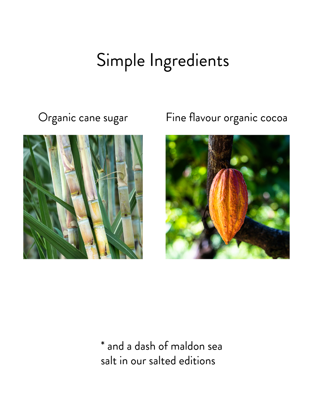 organic cocoa beans, organic cane sugar (1% Maldon salt if its our 72% Sea Salt flavour)