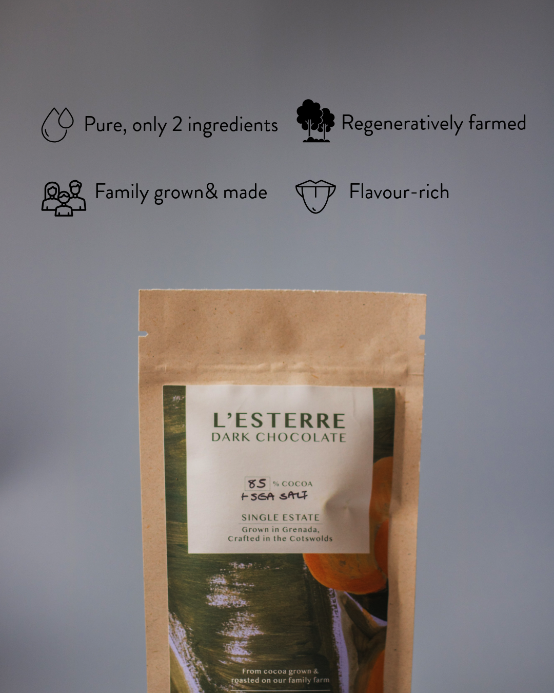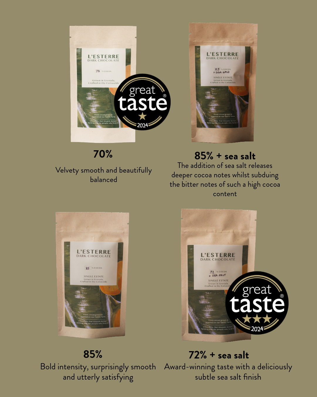 Please note any orders placed from 14th October onwards of this product will be dispatched from Friday 7th November onwards due to low stock of 85% pouches. Apologies for the extended delay, we are a very small production trying to keep up with orders so do bear with us! If you do need your order sooner and are happy to switch out a 85% for either 70% or 72%, please let us know by either making a note on your order or emailing hello@lesterrechocolate.com